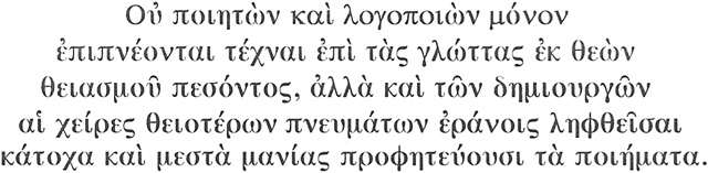 Furor autem divinus est qui ad supera tollit, ut in eius definitione consistit. Quatuor ergo divini furoris sunt speties. Primis quidam poeticus furor, alter mysterialis, tertius vaticinium, amatorius affectus est quartus. Est autem poesis a Musis, mysterium a Dionysio, vaticinium ab Apolline, amor a Vernere. (Marsilio Ficino - Commenatrium in Convivium Platonis, VII, 14) |