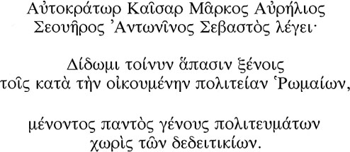 (Do igitur omnibus peregrinis, qui in orbe terrarum sunt, civitatem Romanorum, manente omni genere civitatum, exceptis deticidiis.) Constitutio Antoniniana