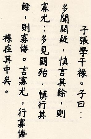 Herr Zhang fragte danach, was zu tun sei, um ein gutes Gehalt zu verdienen. Der Meister sprach: Man muß Vieles hören, die Gefahren argwöhnisch betrachten und über das Übrige achtsam reden. So ist man frei von Schwierigkeiten. Man muß Vieles sehen, die Gefahren verringern und das Übrige achtsam durchführen. So entsteht wenig Reue. Man muß gefahrlos sprechen und ohne viel Reue handeln. Hierin liegt das Verdienst. |