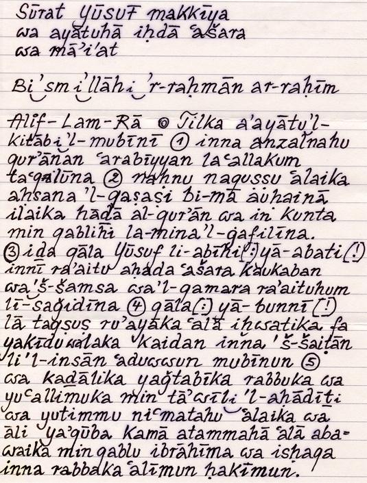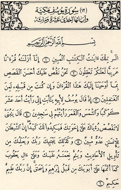 Im Namen des barmherzigen und gnädigen Gottes. l 'lr. Dies sind die Verse (w. Zeichen) der deutlichen Schrift. 2 Wir haben sie (d. h. die Schrift) als einen arabischen Koran hinabgesandt. Vielleicht würdet ihr verständig sein. 3 Wir geben dir dadurch, daß wir dir diesen Koran (als Offenbarung) eingegeben haben, den besten Bericht. Du hattest vordem (d. h. ehe dir der Koran eingegeben war) keine Ahnung davon. 4 (Damals) als Joseph zu seinem Vater sagte: , Vater! Ich habe (im Traum) elf Sterne und die Sonne und den Mond gesehen. Ich sah sie (voller Ehrfurcht) vor mir niederfallen' 5 Sein Vater (w. Er) sagte: ,Mein Sohn! Erzähle dein Traumgesicht nicht deinen Brüdern, sonst werden sie eine List gegen dich anwenden! Der Satan ist dem Menschen ein ausgemachter Feind (und immer bereit, Zwietracht zu stiften). 6 So (wie du geträumt hast?) wird dein Herr dich erwählen. Und er wird dich lehren, Geschichten zu deuten, und seine Gnade an dir und an der Sippe Jakobs vollenden, so wie er sie früher an deinen beiden (Vor)- vätern Abraham und Isaak vollendet hat. Dein Herr weiß Bescheid und ist weise.' |